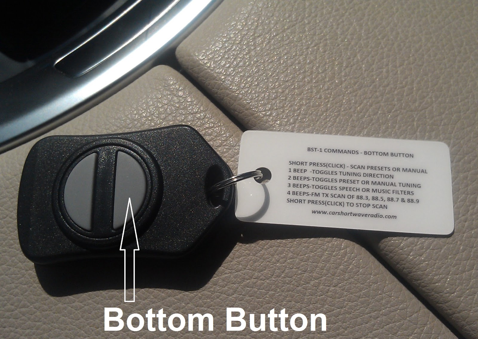Morse Code Annunciation! - If you know Morse code for the numbers 0-9 (very easy to learn), you can use the Key-Fob to activate a Morse code annunciation of tuned frequency. This aids in operation if your FM receiver doesn't have RDS display or if you can't look at the display on the FM radio while driving.